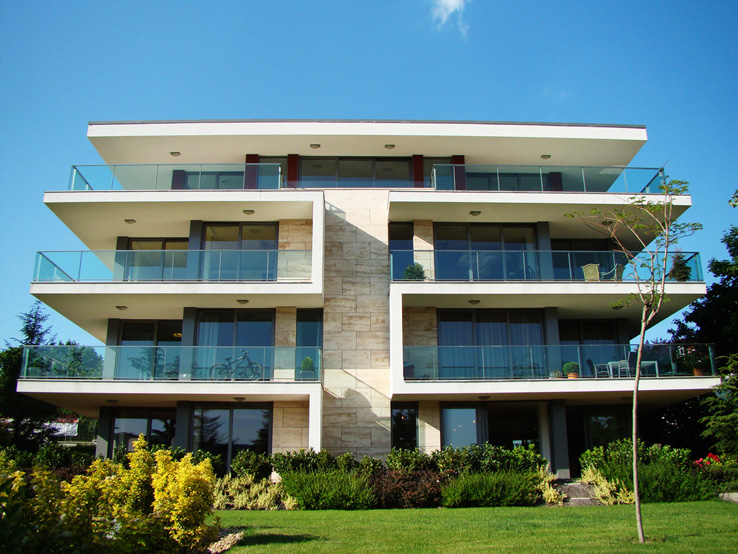 AZ ÉPÜLET TISZTA GEOMETRIAI SZERKESZ- TÉSŰ HOMLOKZATA GYÉMÁNTKEFÉLT GAZ- DABÁNYAI MÉSZKŐBURKOLATTAL, TRESPA METEON FALBURKOLATTAL ANTRACITME- TÁL, ALUMÍNIUM TŰGÖRGŐS SCHÜCO NYÍ- LÁSZÁRÓKKAL, SELYEMFÉNYŰ ROZSDA- MENTES ACÉL KERETBE ÉPÍTETT JÁDE ÁRNYALATÚ ÜVEGMELLVÉDEKKEL, KVARC KRISTÁLYOS FEHÉR VAKOLATTAL KÉSZÜLT.