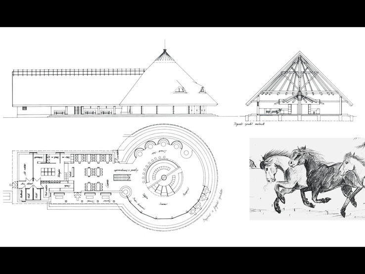 AZ ÚJ NEMZETI LOVAS PROGRAMHOZ ILLESZKEDŐ ALFÖLDI LOVAS TANYA TERVÉT EGYRÉSZT A TRADICIONÁLIS ÉPÍTÉSZETI ÉR- TÉKEK TISZTELETE JELLEMZI, MÁSRÉSZT A NÉPI ÉPÍTÉSZETI ELEMEK MODERN KORNAK MEGFELELŐ ÚJSZERŰ INNOVATÍV ÁTÉR- TELMEZÉSE. PL.: "BÚBOS SZAUNA" VAGY "SZÁRAZ MALOM DRINK BÁR" STB...