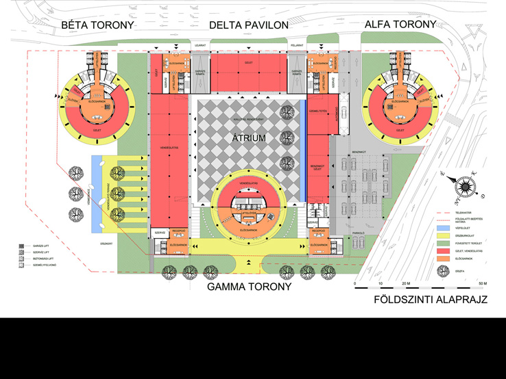 A FÖLDALATTI SZINTEKEN GÉPJÁRMŰ TÁROLÓK, A FÖLDSZINTEN ÉS AZ ELSŐ EMELETEN ÜZLETEK, VENDÉGLÁTÁS. AZ EMELETI SZINTEKEN IRODÁK, SZÁLLODA TERVEZETT ÖSSZESEN 100.000 M2 BRUTTÓ SZINTTERÜLETEN.