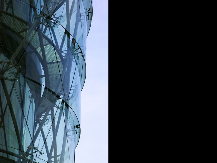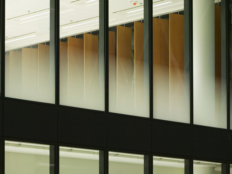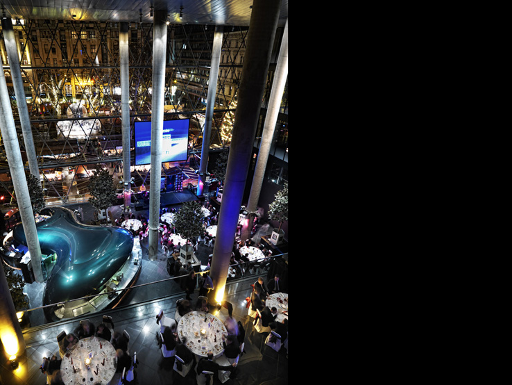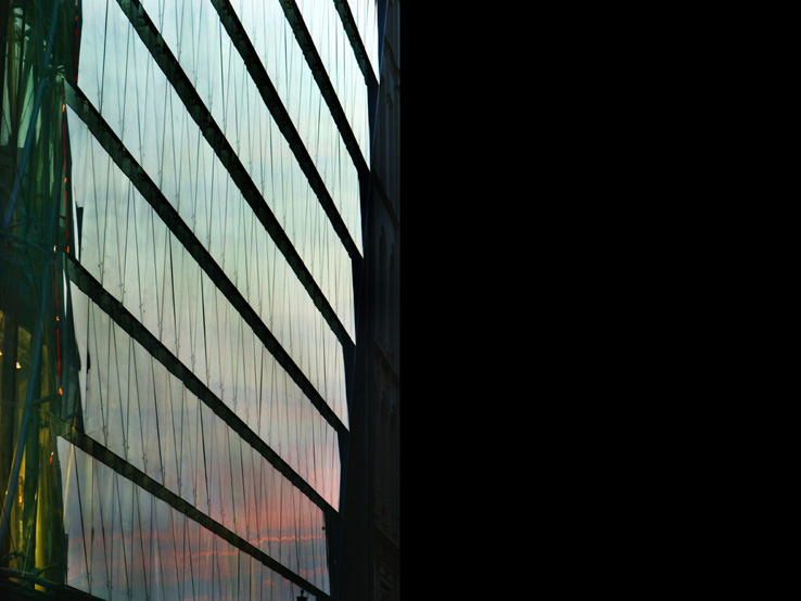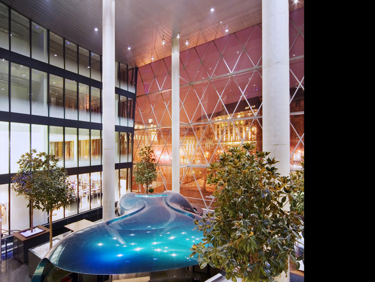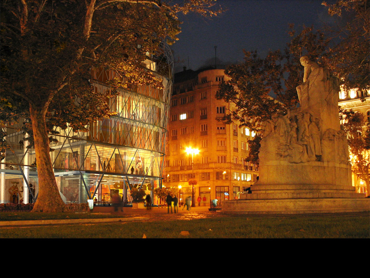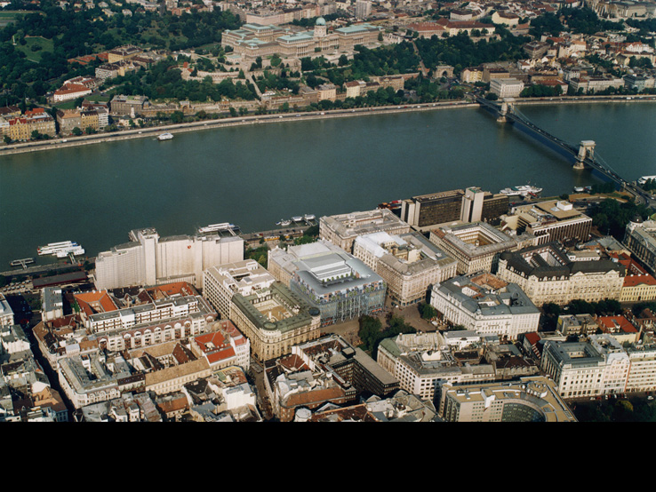 AZ ÉPÜLET TÉRSTRUKTÚRÁJA EGYEDI: EGYRÉSZT KÖVETI A BELVÁROSBAN EL- TERJEDT KERETES BEÉPÍTÉSI MÓDOT, MÁS- RÉSZT A VÖRÖSMARTY TÉR ÉS SZOBOR TENGELYÉRE SZERKESZTETT TRANSZPA- RENS ÁTRIUM RÉVÉN KOMMUNIKÁL A KÖZ- TÉRREL.